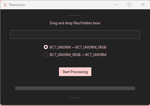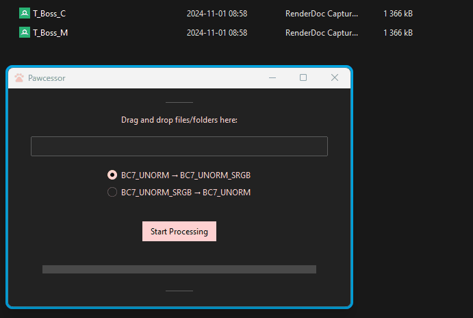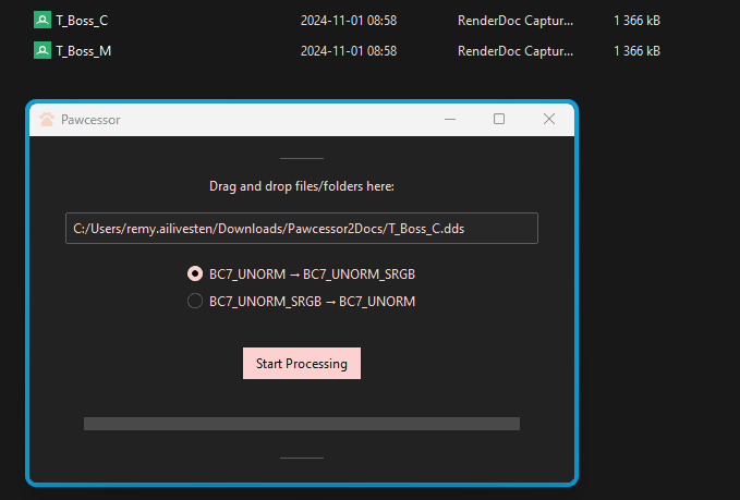 So for our boss color texture we would select “_C = BC7_UNORM → BC7_UNORM_SRGB” and then hit “Start Processing”, as easy as that!