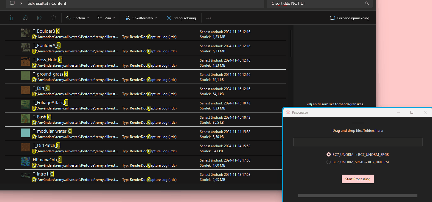 HOWEVER! Hypothetically, if you have multiple color textures you could do all of those at once! So if someone wanted to, say for example, convert every dds file named that ended with _C except for files that start with UI_ they could search “_C sort:dds NOT UI_” and then drag every file they wanted to convert to the program.